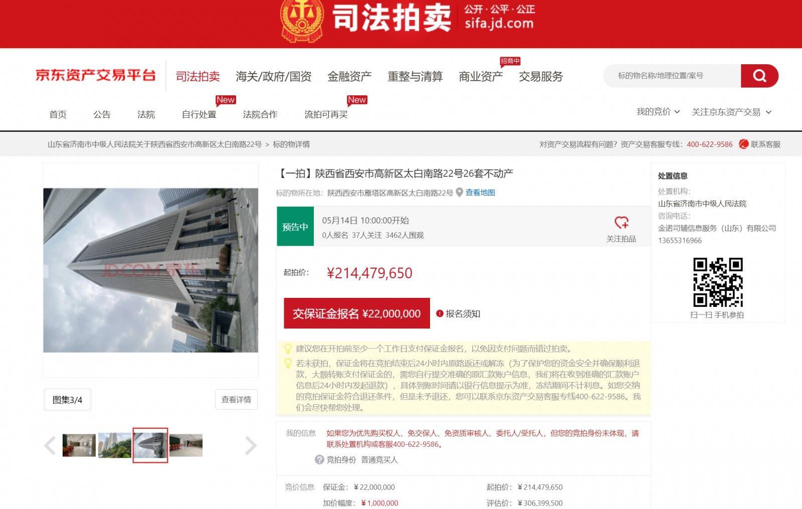 据介绍,拍卖标的物位于陕西省西安市高新区太白南路22号,备案名为坤元SOHO1#办公楼,即西安建工集团总部大楼。标的总建筑面积24604.11平方米,为24层钢筋混凝土结构,2017年建成,土地性质为商服用地,产权年限至2056年。