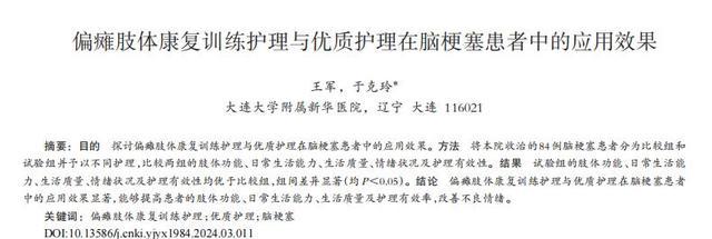 [1]王军.偏瘫肢体康复训练护理与优质护理在脑梗塞患者中的应用效果,中国冶金工业医学杂志,2024-06-04